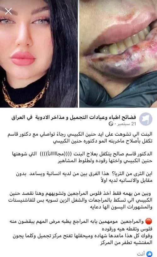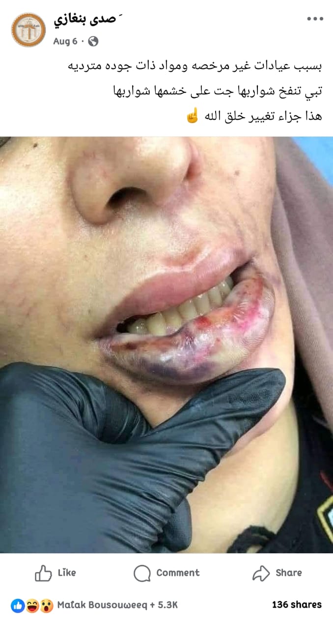 تداولت صفحات على مواقع التواصل الاجتماعي، من بينها صفحة «صدى بنغازي»، منشورًا مرفقًا بصورة لامرأة تُظهر تورمًا وتشوهًا في الوجه، مع الزعم بأنها سيدة ليبية تعرضت لتشوّه بعد حقن تجميلي في عيادة غير مرخصة، وأن الحادثة نتيجة استخدام مواد ذات جودة متردية.