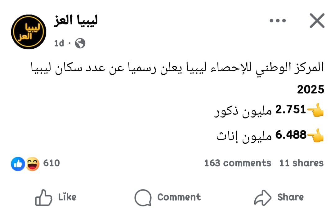 انتشر على مواقع التواصل الاجتماعي، عبر حسابات على فيسبوك، ادعاء بأن المركز الوطني للإحصاء في ليبيا أعلن رسميًا عن عدد سكان ليبيا لعام 2025، وجاء التوزيع كالآتي :