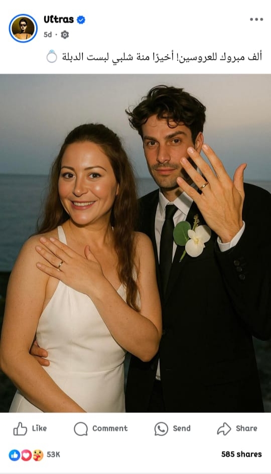 وانتشرت الصورة كالنار في الهشيم، من خلال حساب شهير على موقع «فيسبوك» يدعى Ultras، وكتب معلقًا: “ألف مبروك للعروسين! أخيرًا منة شلبي لبست الدبلة”، مما دفع البعض للاعتقاد أن الفنانة قد أعلنت زواجها بالفعل.