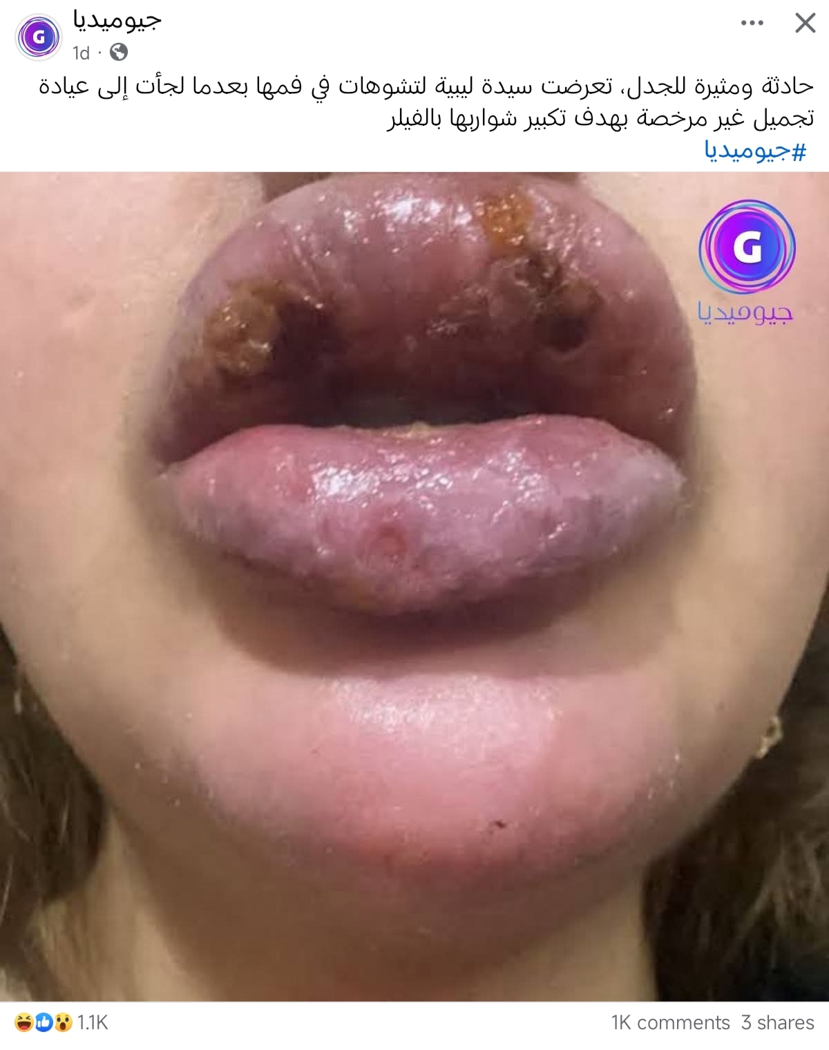 انتشرت على وسائل التواصل الاجتماعي، خصوصًا في منشور على فيسبوك هنا ، صورة لوجه مشوه يُزعم أنها تعود لسيدة ليبية لجأت إلى عيادة تجميل غير مرخصة بهدف حقن الفيلر، مما أدى إلى تشوه خطير في فمها.وقد أُرفق مع الصورة تعليق يوحي بأن الحادثة وقعت مؤخرًا داخل ليبيا، مما أثار جدلًا واسعًا واستنكارًا بين المستخدمين.