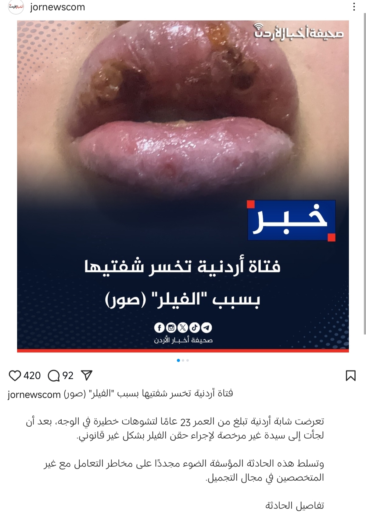 وفقًا لما نشره موقع أخبار الأردن، فإن الشابة لجأت إلى سيدة غير متخصصة وغير مرخصة لإجراء حقن فيلر بشكل غير قانوني، مما أدى إلى إصابتها بتشوهات خطيرة في الوجه، وخاصة في منطقة الشفاه.