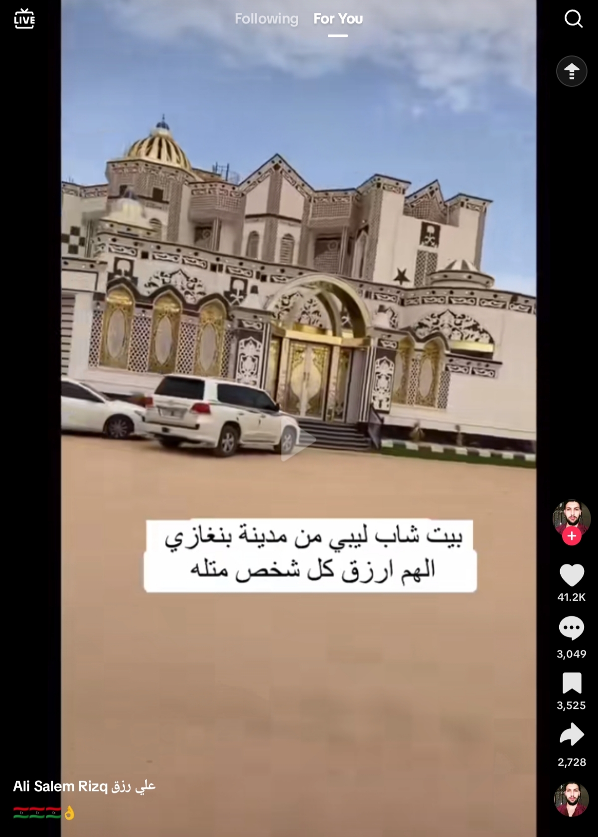 تداول مستخدمون على تطبيق “تيك توك” مقطعَي فيديو يظهران منزلاً فخماً بتصميم يشبه القلاع الأوروبية، وزُعم أن المنزل يعود لشاب ليبي قام ببنائه في ليبيا. وقد حقق الفيديوان انتشاراً واسعاً بين المستخدمين، وسط تفاعل لافت وإشارات إلى أنه رمز للثراء والترف في البلاد.هنا