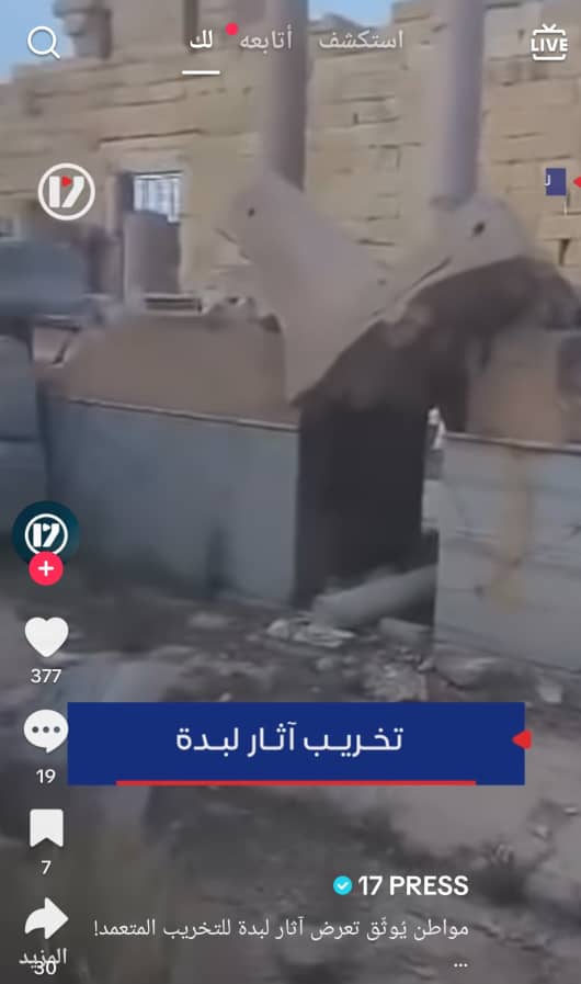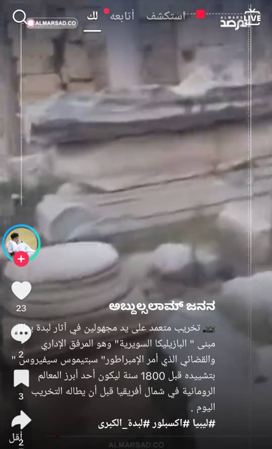 تناقلت وسائل الإعلام المحلية وعدد من حسابات تطبيق تيك توك خبراً يُفيد بوقوع عمل تخريبي استهدف أحد العناصر المعمارية بمبنى البازيليكا في الميدان الجديد بمدينة لبدة الأثرية هنا و هنا.