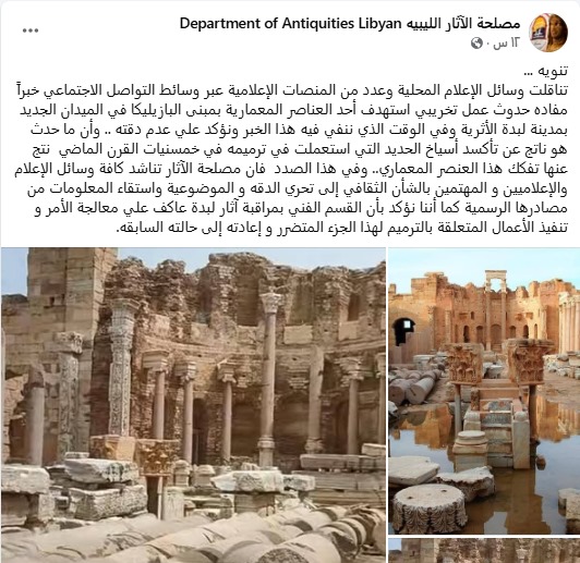 بعد البحث والتدقيق في الصفحات الرسمية، ومحاولة التواصل مع الجهات المختصة، تبين أن الخبر مضلل. إذ أوضحت مصلحة الآثار الليبية عبر حسابها على الفيس بوك هنا أن الضرر الحاصل في مبنى البازيليكا بمدينة لبدة الأثرية ناتج عن عوامل طبيعية، نتيجة تأكسد أسياخ الحديد المستخدمة في أعمال الترميم منذ خمسينيات القرن الماضي، وليس نتيجة لأي عمل تخريبي كما أشيع.