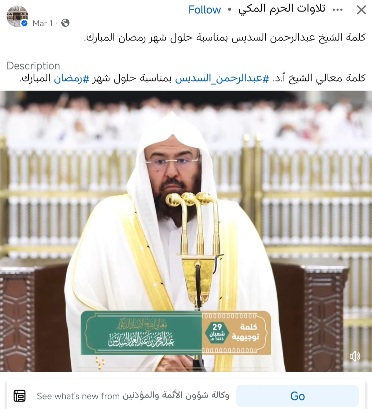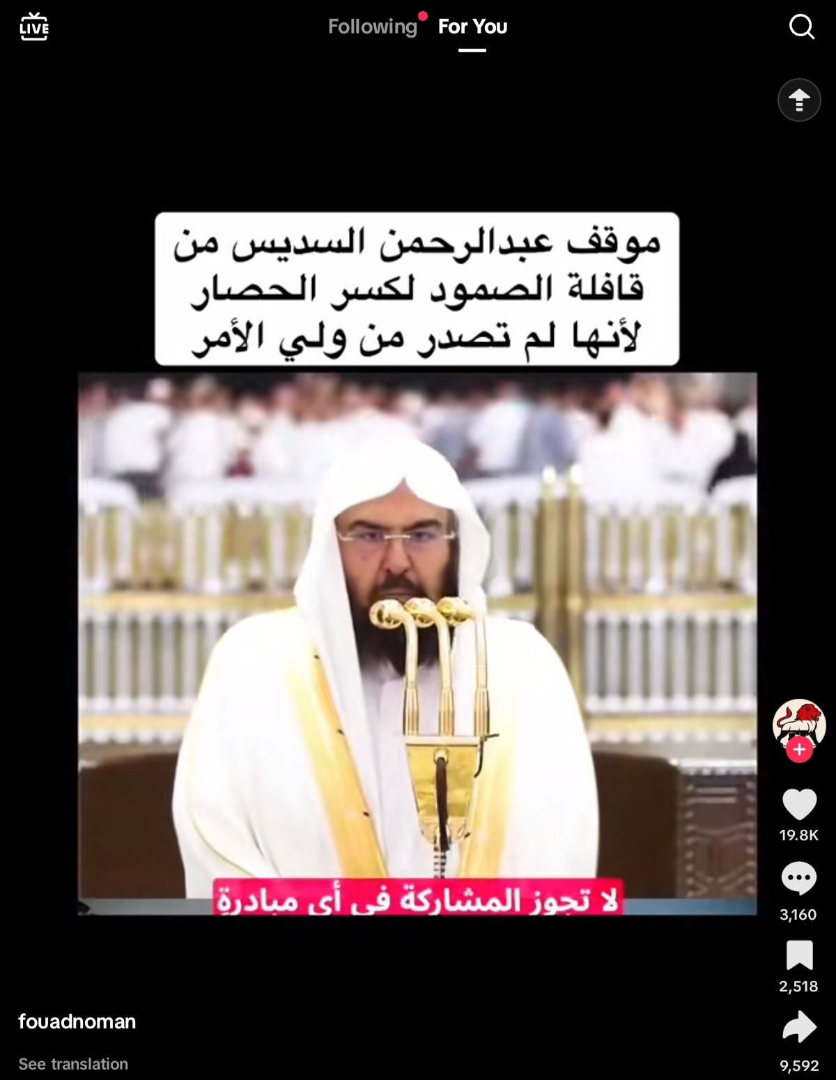تداول مستخدمي منصة “تيك توك” خلال الأيام الأخيرة مقطع فيديو منسوب للشيخ عبد الرحمن السديس، يظهر فيه وهو يدلي بتصريحات حول “قافلة الصمود” المغاربية، وذلك عبر عدة حسابات مختلفة على المنصة، مثل تلك المنشورة هنا وهنا.