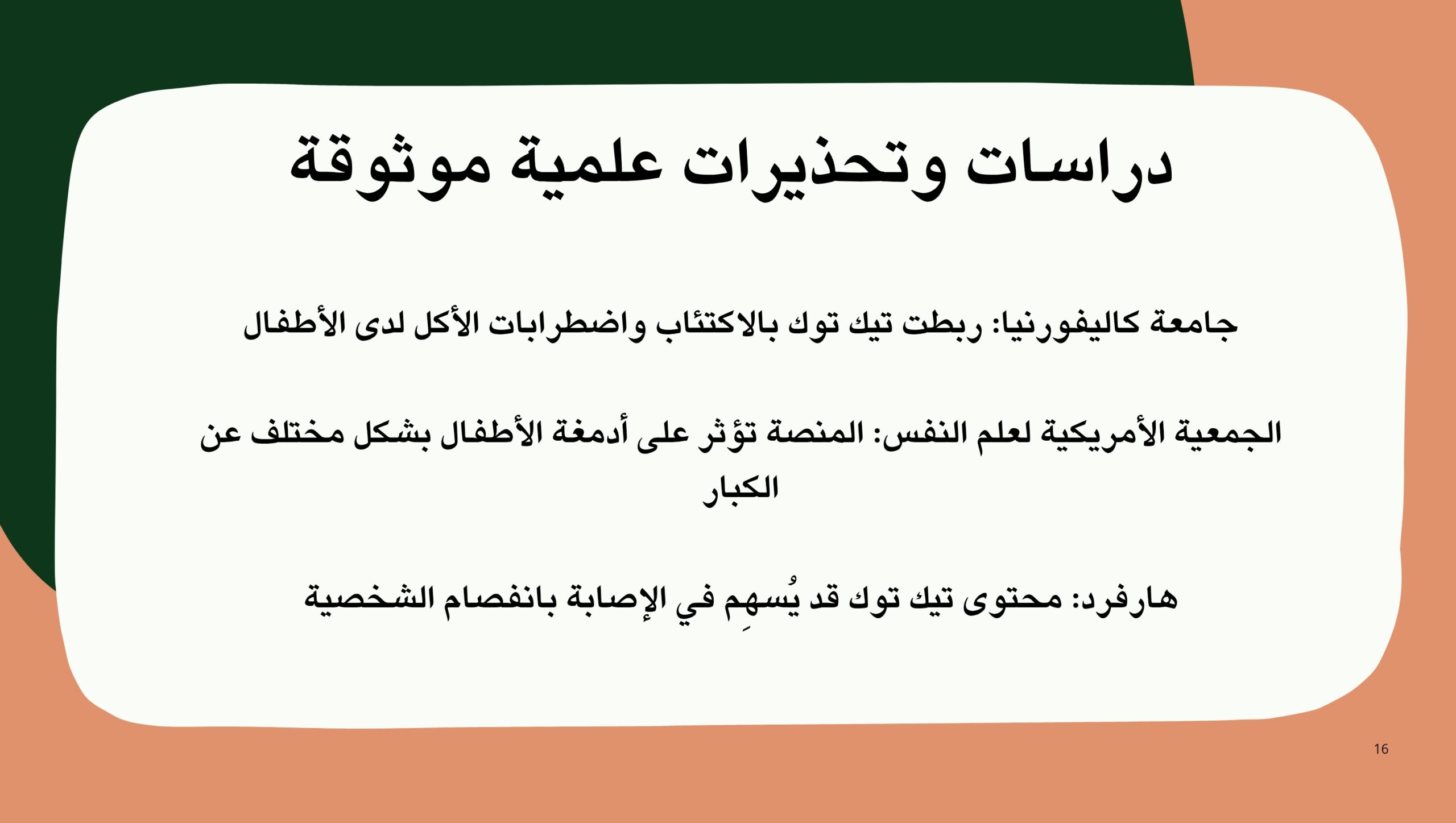 تشير دراسات حديثة من جامعة كاليفورنيا وجامعة هارفرد الأمريكية لعلم النفس إلى أن الاستخدام المكثف لـ”تيك توك” قد يؤدي إلى اضطرابات نفسية كالاكتئاب واضطرابات الأكل والسلوك العدواني، وقد تم الربط بين المحتوى الذي يتعرض له الأطفال عبر التطبيق واحتمالات الإصابة بانفصام الشخصية.