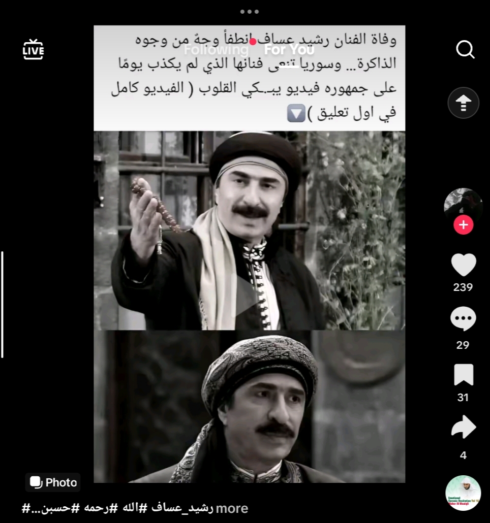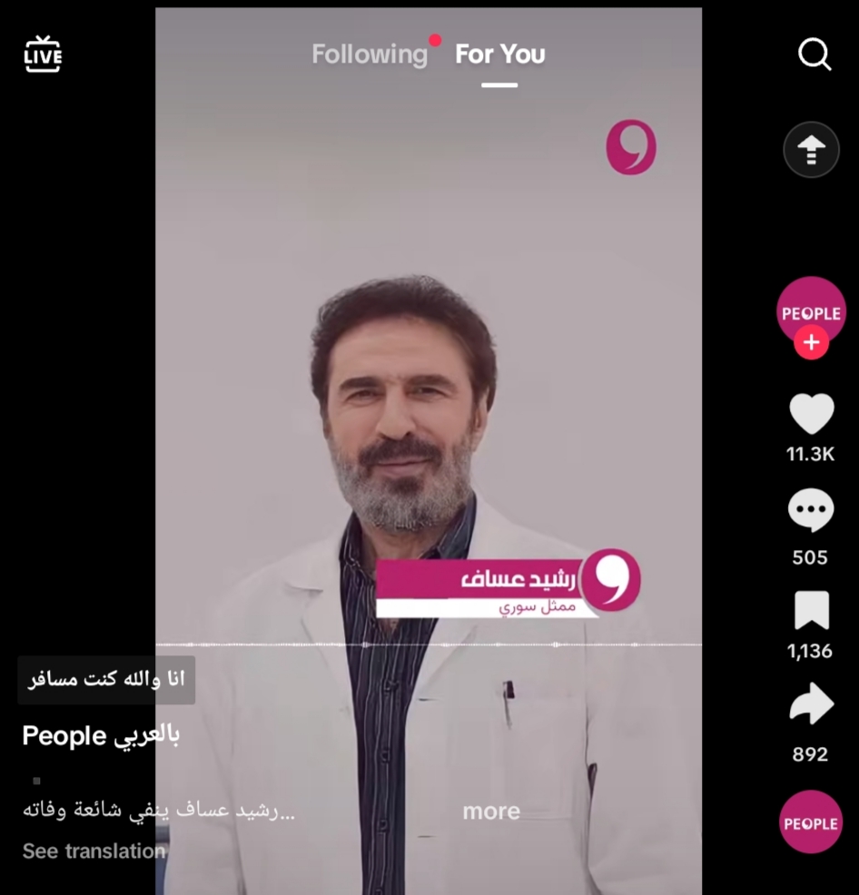 تداولت حسابات عدة عبر منصة تيك توك خبرًا يُفيد بوفاة الفنان السوري رشيد عساف. زعمت هذه الحسابات أن الفنان توفي، ونُشر الادعاء في مقاطع وصور متعددة يمكن مشاهدتها هنا وهنا